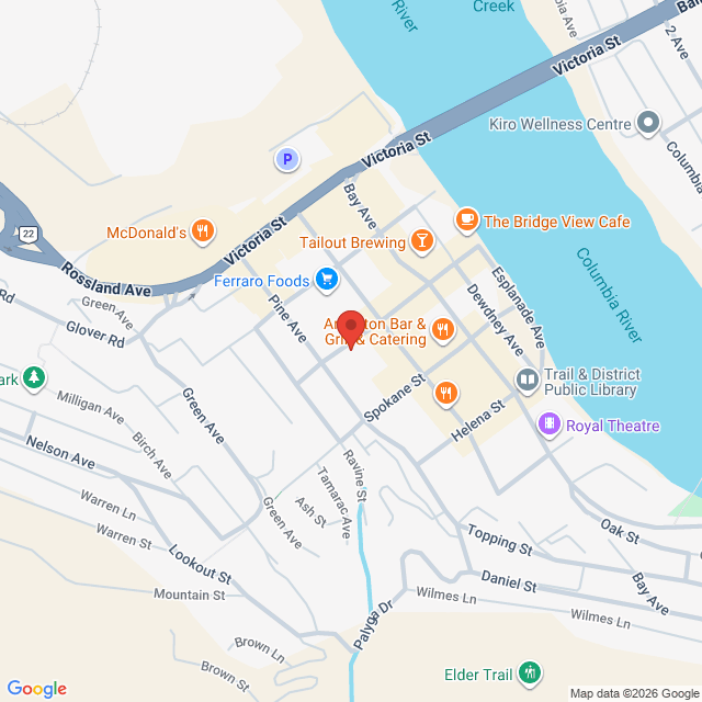 Pine & Needle Wellness is located at 860 Eldorado St, in downtown Trail, at street level, across from the Ferraro's parking lot. An accessibility ramp is available to the right of the front door. The doors remain locked for safety and access is available via doorbell about 5-10 minutes before your appointment. Street parking is available in the neighbourhood.
